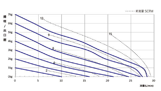 ※測試條件:室溫純水,全開出入口內徑18mm,氣源管內徑4mm。 ※性能曲線會依實際使用而有所變動。 ※全開入口內徑:9.5mm,氣源管內徑4mm,得最大流量23L/min。 |