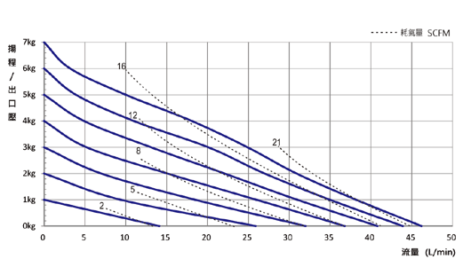 ※測試條件:室溫純水,全開出入口內徑22.3mm,氣源管內徑4mm。 ※性能曲線會依實際使用而有所變動。 ※全開入口內徑:16mm,氣源管內徑4mm,得最大流量59L/min。 |